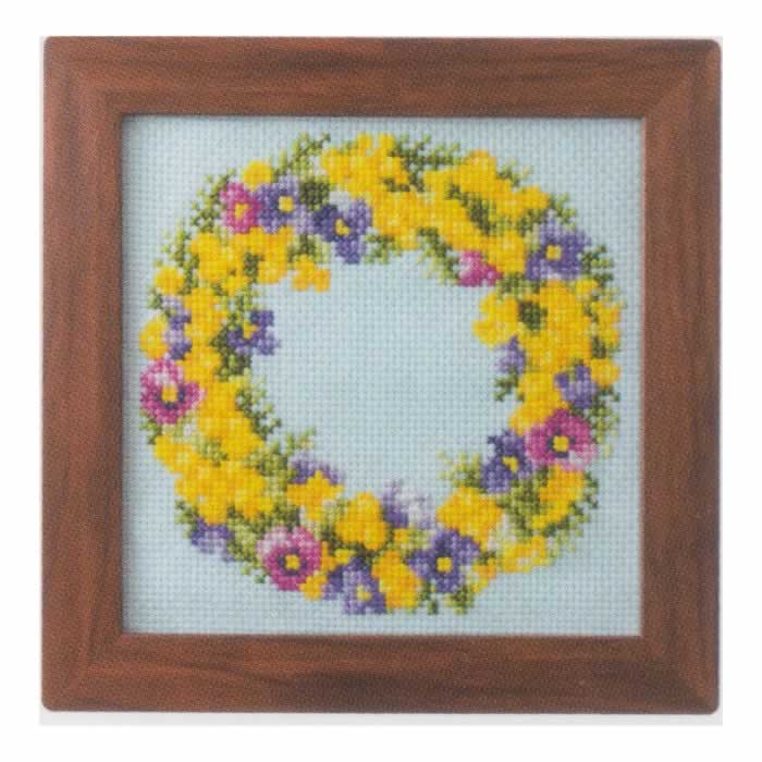 季節を彩るフラワーアレンジメント-ミモザのリース-ルシアン-コスモ-クロスステッチ-刺繍キット(送料込み)
