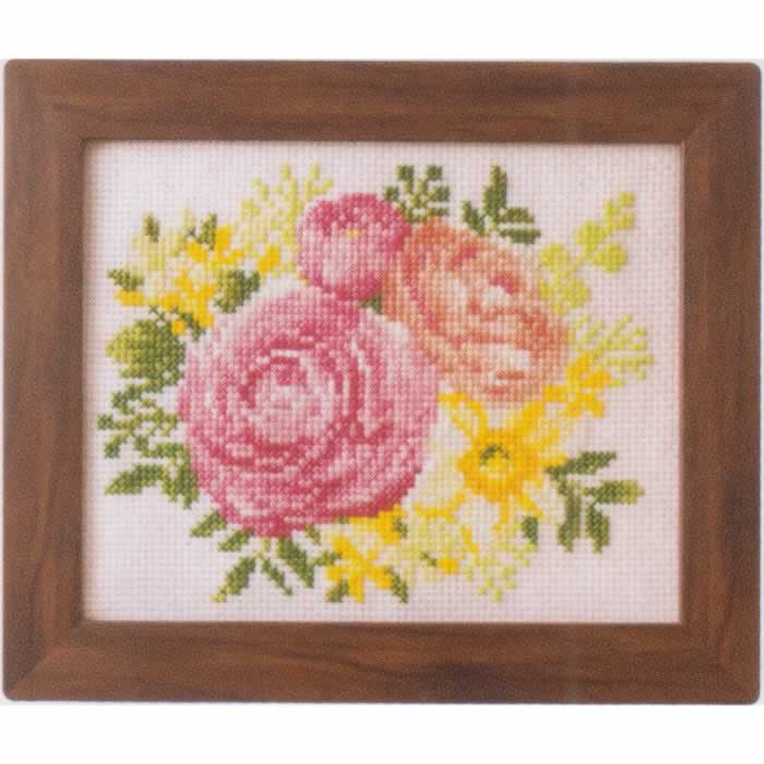 季節を彩るフラワーアレンジメント-ラナンキュラスとスイセン-ルシアン-コスモ-クロスステッチキット(送料込み)